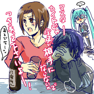 マスターもお酒嫌いじゃないけどそんなに強くなくていつもMEIKOにつぶされる。MEIKO様最強伝説。ミクリンレンはこぞって潰れた人らのお世話役か?カワイソス